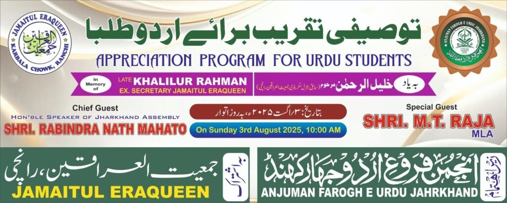 رانچی: اردو زبان و ادب، تعلیم اور سماجی شعور کے فروغ کے لیے سرگرم انجمن فروغ اردو جھارکھنڈ کے زیر اہتمام 3 اگست 2025 بروز ہفتہ کو ایک باوقار توصیفی تقریب کا انعقاد کیا جا رہا ہے، جس میں میٹرک و انٹرمیڈیٹ کے ان طلبہ و طالبات کی عزت اورحوصلہ افزائی کی جائے گی جنہوں نے حالیہ امتحانات میں نمایاں کامیابی حاصل کی ہے۔ یہ تقریب گلشن میرج ہال، کربلا چوک، رانچی میں صبح 10 بجے سے شروع ہوگی۔واقع ہو کہ یہ پروگرام مرحوم خلیل الرحمٰن (سابق سیکریٹری جمعیت العراقین) کی یاد میں منعقد کیا جا رہا ہے۔ ان کی تعلیمی و ملی خدمات کے اعتراف کے طور پر اس تقریب کو ایک یادگاری شکل دینے کی کوشش کی ہے جس میں جمعیت العراقین کا فعال تعاون بھی شامل ہوگا۔تقریب میں رانچی اور اطراف کی ان پنچایتوں اور سوسائٹیوں کو مدعو کیا جا رہا ہے جو ملت کے اجتماعی اور فلاحی امور میں متحرک کردار ادا کر رہی ہیں۔ ان میں راعین پنچایت، ادریسیہ پنچایت، گدی پنچایت، مومن پنچایت، قریشی پنچایت، بریاتو خان پنچایت، پٹھان پنچایت کے علاوہ ماہی سوسائٹی، مرحبا ہیومن سوسائٹی، پبلک اردو لائبریری، نوائے اردو جھارکھنڈ، انجمن اسلامیہ، ادارہ ترقی اردو، انجمن فروغ اردو جھارکھنڈ اور دیگر سماجی و تعلیمی ادارے شامل ہیں۔پروگرام میں ریاست کی معروف شخصیات کو مدعو کیے جانے پر اتفاق ہوا ہے، جن میں جھارکھنڈ اسمبلی کے اسپیکر ربندر ناتھ مہتو، ایم ایل اے ایم ٹی راجہ، راجیہ سبھا کی رکن مہوا ماجی، مجلس علماء جھارکھنڈ کے جنرل سیکریٹری مفتی طلحہ ندوی، جمعیت علماء ہند جھارکھنڈ کے جنرل سیکریٹری مولانا اصغر مصباحی اور انجینئر عالم وغیرہ کے شامل ہونے کا گمان اغلب ہے۔