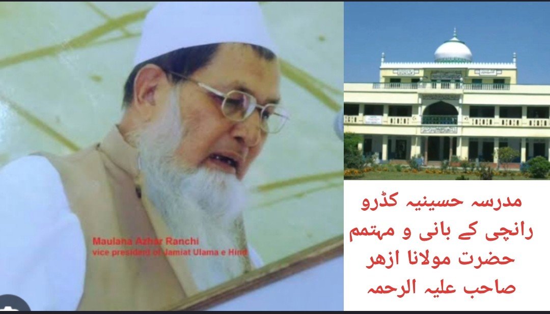 علامہ اقبال کا یہ شعر مدرسہ حسینیہ کڈرو رانچی کے بانی و مہتمم حضرت مولانا ازھر صاحب علیہ الرحمہ پر صادق آتا ہے ، مولاںا ازھر صاحب کی شخصیت اور ان کی خدمات کا پورا نقشہ مدرسہ حسینیہ کڈرو رانچی کو ایک بار دیکھ لینے سے ہی ظاہر ہو جاتا ہے اور بخوبی اندازہ ہو جاتا ہے کہ مولانا ازھر صاحب نے کڈرو رانچی میں مدرسہ حسینیہ قائم کرکے جھاڑکھنڈ اور خصوصاً رانچی کے مسلمانوں کیلئے دینی تعلیم و تربیت کا ایک ایسا علمی چشمہ جاری کردیا ہے جس سے رانچی ہی نہیں بلکہ جھارکھنڈ ، بہار ، بنگال اور اڑیسہ کے بچے اپنی علمی پیاس بجھا رہے ہیں ، مولانا ازھر صاحب رحمۃ اللہ علیہ بنیادی طور پر بہار کے ضلع مدھو بنی کے رہنے والے تھے ، آپ کی پیدائش غالباً 1917 میں کمتول بلاک کے گاؤں رہتوس ضلع مدھو بنی بہار میں ہوئی ، آپ کی ابتدائی تعلیم محمود العلوم دملہ مدھوبنی بہار میں ہوئی اور فراغت 1954 میں مادر علمی دارالعلوم دیوبند سے ہوئی ، آپ کے ساتھیوں میں قاضی مجاھد الاسلام قاسمی ، مولانا عبد الرحیم بستوی ، شیخ عبد الحق شیخ الحدیث دارلعلوم دیوبند اور مولانا احمد علی قاسمی وغیرہ جیسے جید علماء کرام تھے ، دارالعلوم دیوبند سے فراغت کے بعد چار سالوں تک آپ شیخ العرب والعجم حضرت مولانا سید حسین احمد مدنی رحمۃ اللہ علیہ کی خدمت میں رہے ، آپ حضرت مدنی کے خاص شاگرد و خادم تھے ، آپ کو حضرتِ مدنی سے بڑی قربت حاصل تھی ، آپ ہر وقت ان کی خدمت میں رہتے تھے ، حضرت مولانا ازھر صاحب علیہ الرحمہ 1958 کو حضرت مولانا قاری فخر الدین علیہ الرحمہ کے توسط سے رانچی تشریف لائے ، ہوا یوں کہ مدرسہ قاسمیہ گیا کے بانی و مہتمم حضرت مولانا قاری فخر الدین علیہ الرحمہ کا اپنے مدرسہ کے سلسلے میں رانچی آنا جانا لگا رہتا تھا ، انھوں نے دیکھا کہ رانچی شہر میں ایک بھی نہ کوئی مکتب ہے اور نہ کوئی مدرسہ ہے تو انھوں نے دیوبند میں حضرت مدنی رحمۃ اللہ علیہ سے رانچی کا ذکر کرتے ہوئے اور حضرت مولانا ازھر صاحب کی طرف اشارہ کرتے ہوئے کہا کہ حضرت آپ اپنے اس خادم کو مجھے دے دیجئے میں ان کے ذریعے رانچی میں ایک مدرسہ قائم کرنا چاہتا ہوں ، حضرت مدنی رحمۃ اللہ علیہ نے اجازت دے دی اور آس طرح ایک ولی کامل کی اجازت اور ان کی منشاء کے مطابق مولانا ازھر صاحب مولاںا قاری فخرالدین علیہ الرحمہ کے ساتھ رانچی تشریف لے آئے ، گویا حضرت مولانا ازھر صاحب علیہ الرحمہ حضرت مدنی رحمۃ اللہ علیہ کی منشاء اور دعاء کے ساتھ رانچی تشریف لائے ، رانچی میں ایک مدرسہ قائم کرنے کے سلسلے میں سب سے پہلی نشست شہر کے دردمند حضرات کی راعین مسجد یند پیڑھی رانچی میں ہوئی جس میں قاری فخر الدین صاحب علیہ الرحمہ اور مولانا ازھر صاحب علیہ الرحمہ بھی موجود تھے ، اس طرح کڈرو رانچی میں مدرسہ کھولنے کا متفقہ فیصلہ شہر کے دردمند حضرات کی موجودگی میں ہوا ، سب سے پہلے ابتدائی مرحلے میں ایک مکتب کڈرو رانچی کے حاجی شہود الدیں کے مکان کے باہری حصے میں ایک بچہ سے مولانا ازھر صاحب نے شروع کیا، چونکہ رانچی میں اس مدرسہ کے قائم کرنے میں ایک ولی کامل حضرت مولانا سید حسین احمد مدنی رحمۃ اللہ علیہ کی اجازت اور ان کی دعاء شامل تھی اس لئے اللہ تعالیٰ کے فضل و کرم سے بہت جلد یہ دینی مکتب مدرسہ حسینیہ کی شکل میں تبدیل ہو گیا اور چند ہی برسوں کے بعد مدرسہ اپنی زمین پر چھپر کی عمارت میں بیرونی طلباء کے قیام و طعام کے ساتھ حضرت مولانا ازھر صاحب علیہ الرحمہ کی انتھک محنت و کوشش سے چلنے لگا تو پھر اس کے بانی و مہتمم حضرت مولانا ازھر صاحب نے کبھی پیچھے مڑ کے نہیں دیکھا ، آپ کی نظر ہمیشہ آگے کی منزل کے حصول کی طرف رہی ، کون کیا کہہ رہا ہے اس پر آپ نے کبھی دھیان نہیں دیا بس ساری زندگی اپنی دھن میں مگن رہے ، مدرسہ حسینیہ کی زمین سات قسطوں میں خریدی گئی ، آخری قسط کڈرو عیدگاہ کے بغل کا وہ میداں ہے جو بہار کے دبنگ وزیراعلی جناب لالو پرساد یادو کے دور میں ایک روپیہ میں رجسٹری کراکر مدرسہ حسینیہ میں شامل کیا گیا جس میں مدرسہ حسینیہ کے بانی و مہتمم حضرت مولانا ازھر صاحب کی محنت و 